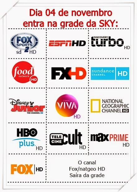 A partir de 04/11: Discovery Turbo HD, Fox Sports 2, Fox Sports 2 HD, ESPN HD, Viva HD, FX HD, National Geographic HD, Telecine Cult HD, Sundance HD, HBO Plus HD, Max Prime HD, Food Network HD e Disney Junior HD entrarão na grade de canais da SKY.
