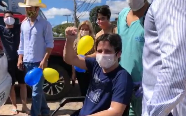 Quando deixou a unidade de saúde em uma cadeira de rodas, o humorista não aguentou e se emocionou com os parentes e amigos que aguardavam ele na saída com balões, aplausos e gritos de “guerreiro”. Ele agradeceu o carinho: “Galera, estou indo embora. Saí. Beijo para todo mundo aí”. Depois, dentro do carro com o irmão, João Pedro, ele falou: “Estou voltando para casa”.