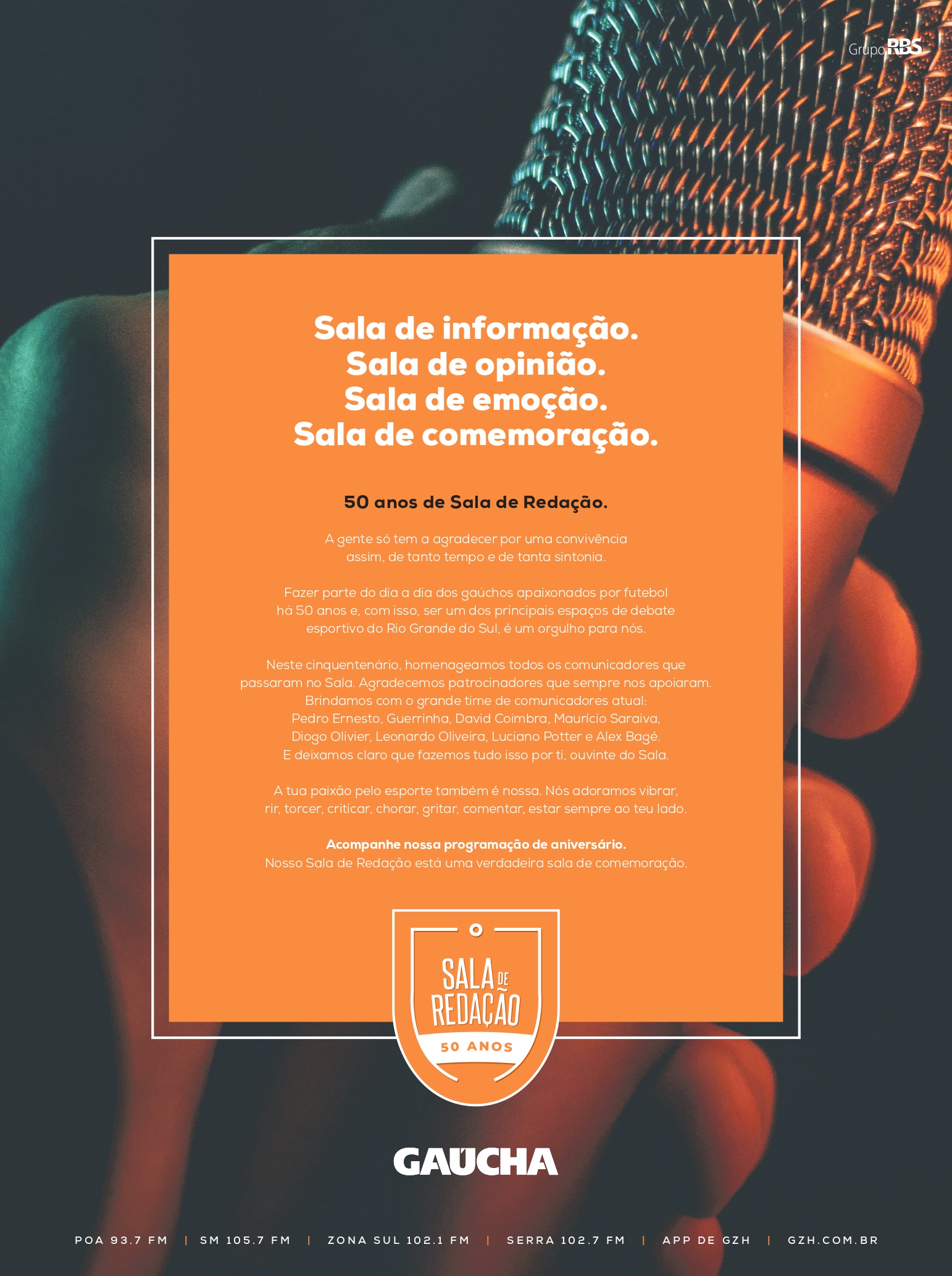 No dia 14 de junho de 1971, na redação do jornal Zero Hora, foi criado o Sala de Redação, programa da rádio Gaúcha que repercutia os principais assuntos jornalísticos e de esporte do dia com a presença de jornalistas e convidados. De lá para cá, o Sala reuniu os apaixonados por futebol e se tornou uma referência no rádio, passando de geração para geração a tradição do debate esportivo e se consolidando como o programa de esporte mais tradicional da Gaúcha e um dos mais prestigiados do país. Resgatando a memória do programa e celebrando a parceria dos ouvintes, o Sala de Redação comemora seus 50 anos de história a partir de ações editoriais especiais e de ações de comunicação 360º.