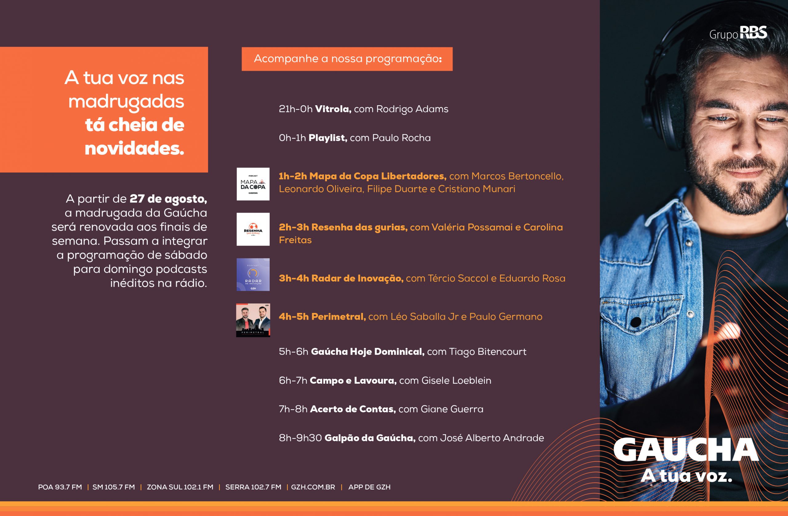 Em uma busca constante para entregar ao público os melhores conteúdos de jornalismo e esporte, a madrugada da Gaúcha será renovada aos finais de semana. A partir deste domingo (27), o ouvinte poderá acompanhar os episódios semanais de podcasts de GZH na programação ao vivo da emissora.
