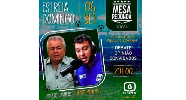 Estreia neste domingo (06), na TV Gazeta, que está transmitindo sua programação para Goiânia no Canal Digital 38.1, o programa esportivo “Mesa Redonda Local”, que será veiculado todos os domingos, de 20h às 21h, e terá a apresentação de Thiago.